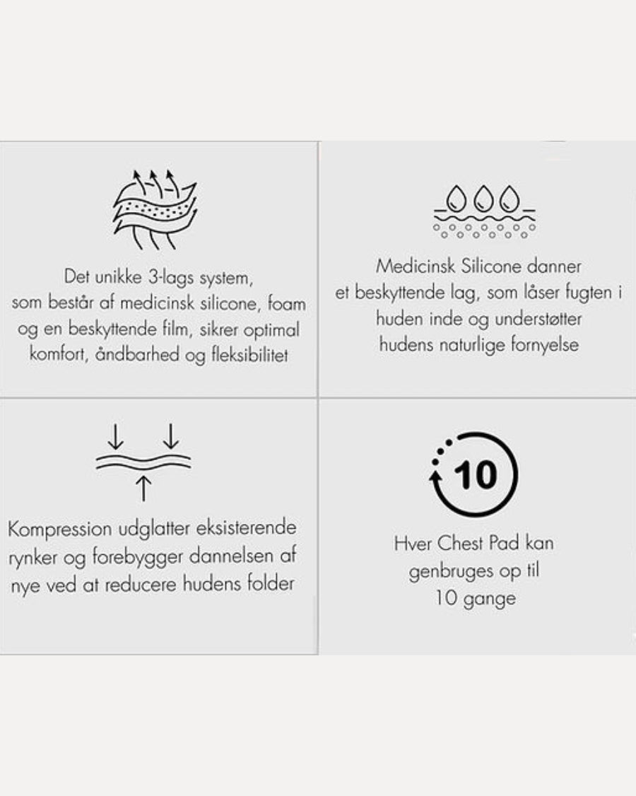 Vores Bye Bye Wrinkles Chest Pad er skabt til dig, der ønsker at forebygge og reducere rynker på brystet – helt enkelt mens du sover. De bløde pads er lavet af medicinsk silikone og former sig skånsomt efter huden for at holde den glat og fugtet gennem natten. Resultatet er en synligt glattere og mere ungdommelig hud allerede efter få ganges brug.